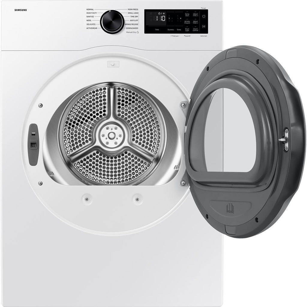 Samsung compact and efficient 4.0 cu. ft. electric dryer designed for convenience and flexibility. Equipped with Smart Control, multiple drying levels, reversible door, dual heater, and 12 cycles including Quick Dry and Sanitize. Built with a stainless-steel drum and LED display, it offers modern performance in a space-saving design.