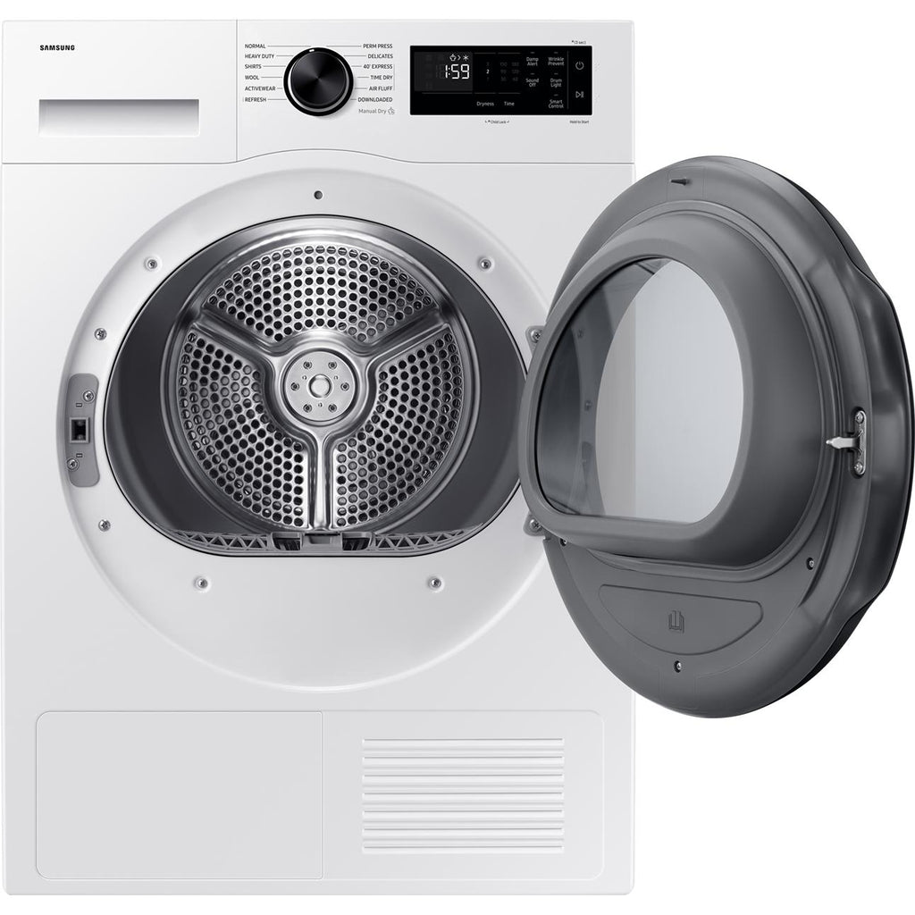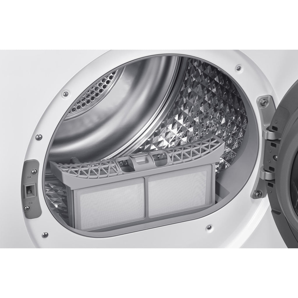 Samsung compact yet powerful dryer ideal for smaller laundry spaces. Featuring heat pump drying technology for greater energy efficiency, LED display, reversible door, and smart control capability, this model offers 12 drying cycles and multiple convenience features including Wrinkle Prevent, Damp Alert, and filter check indicator. ENERGY STAR® certified, it delivers excellent drying performance while reducing power consumption.
