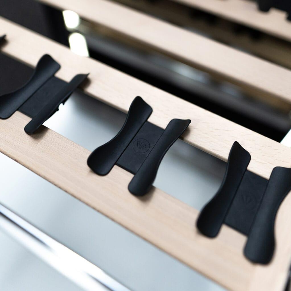 • Charcoal filter, UV-blocking glass, and anti-vibration components create an ideal cellar environment
