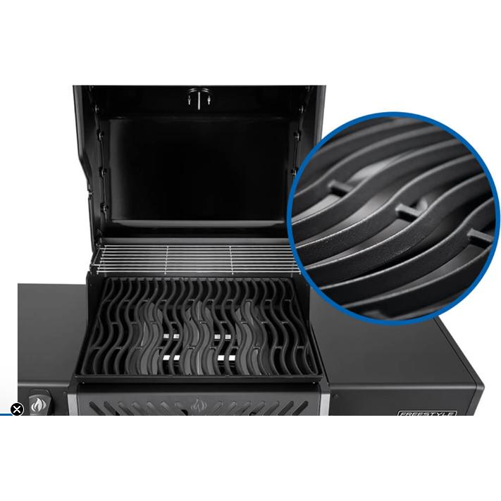 • Grilles de cuisson WAVE™ en fonte émaillée : Grilles résistantes à la rouille offrant une chaleur uniforme avec le design WAVE™ signature de Napoleon. Les ondulations empêchent les aliments de tomber à travers les grilles et créent des marques de cuisson distinctives.